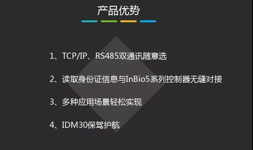 FR5200身份證指紋讀頭采用中控門禁身份證閱讀模塊IDM30,區別于傳統的身份證讀頭,不但能夠讀取身份證信息而且還能實現指紋識別。采用Live ID指紋頭進行數據采集;采用三色燈紅綠藍溫馨提示,打卡、待機輕松區別;采用TCP/IP和RS485雙通訊與InBio5系列控制器進行通訊。