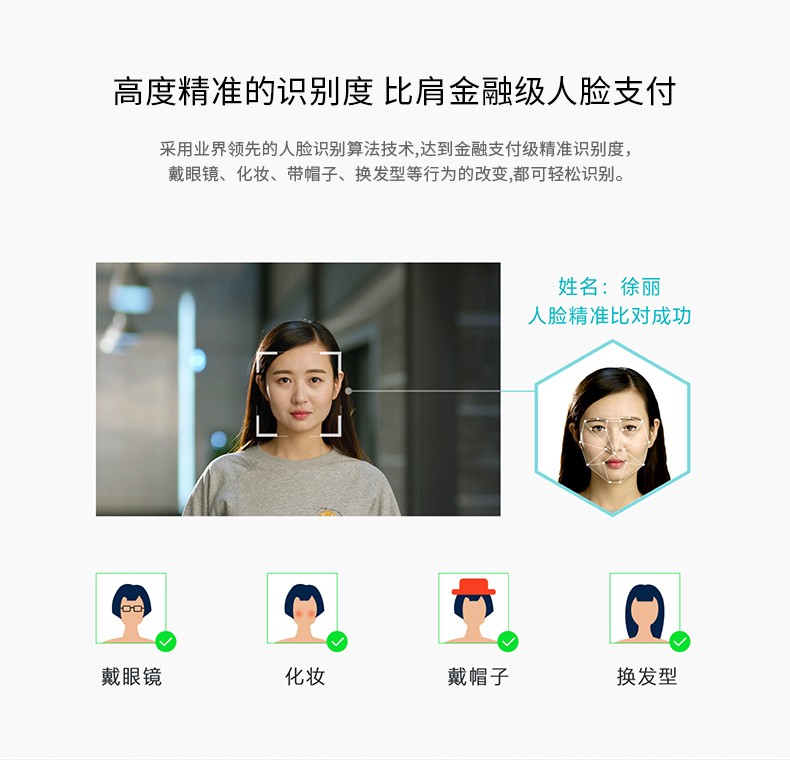 魔點MS4智能人臉閘機柱采用領先的人臉算法識別技術,達到99.99%金融支付級精準識別度,戴帽子、戴眼鏡、化妝、換發型等都可輕松識別。